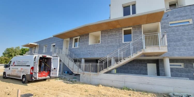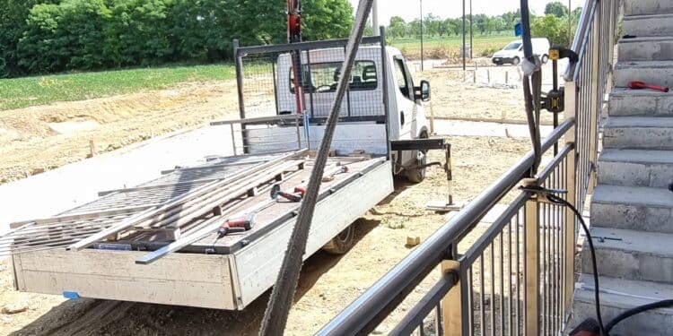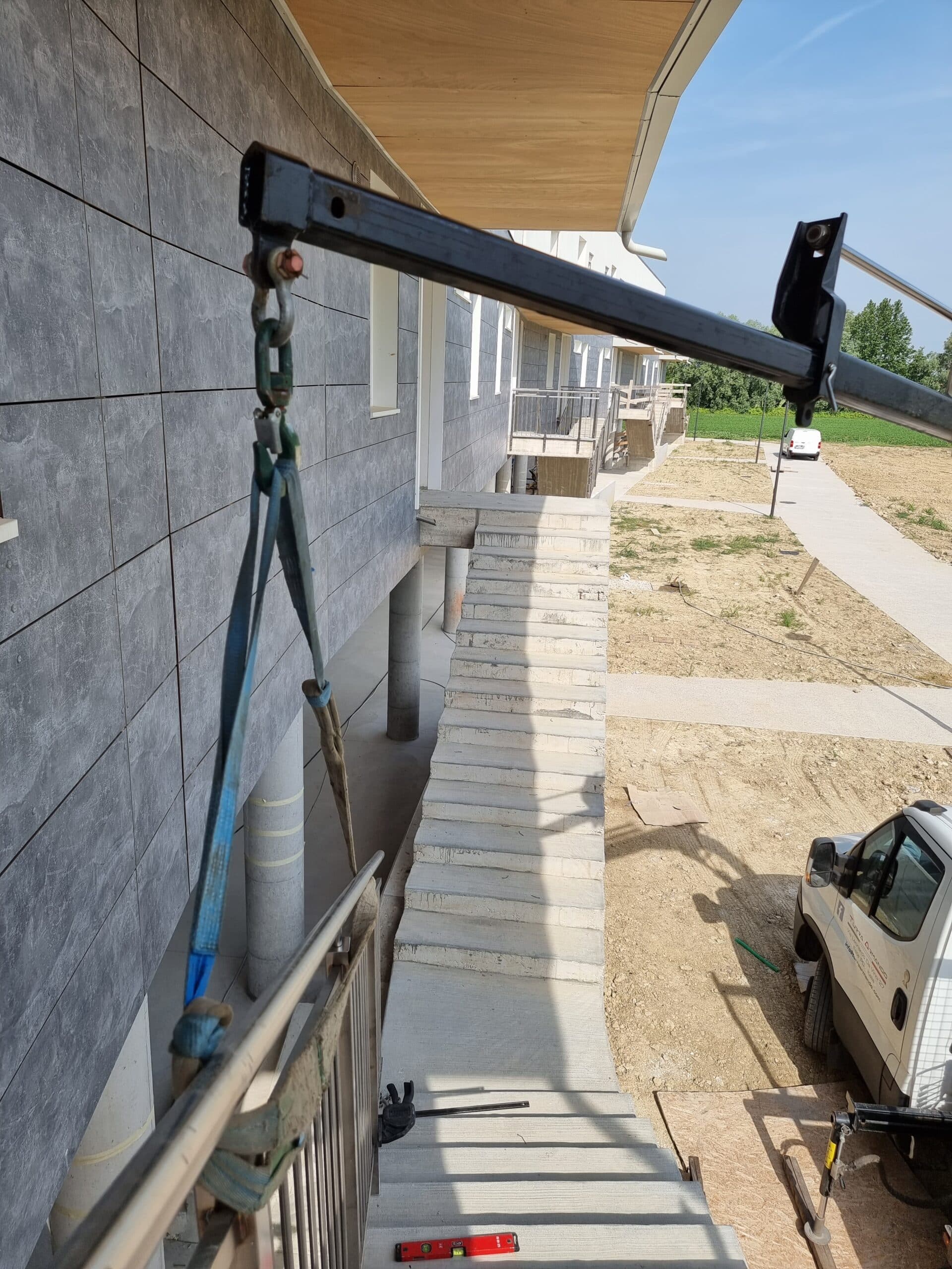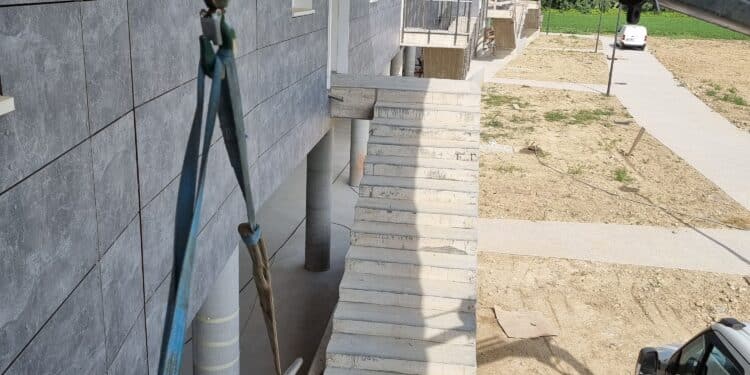 Dalle foto di cantiere si nota la gestione della posa in un edificio ancora in fase di completamento, con gli elementi movimentati e portati in quota prima del fissaggio definitivo. In interventi di questo genere è fondamentale che ogni tratto arrivi già coerente con le misure reali della scala e dei pianerottoli, così da semplificare il montaggio e mantenere continuità tra una rampa e l’altra. Anche la scelta di un disegno a sviluppo verticale contribuisce a dare ritmo al prospetto e a mantenere leggerezza visiva.