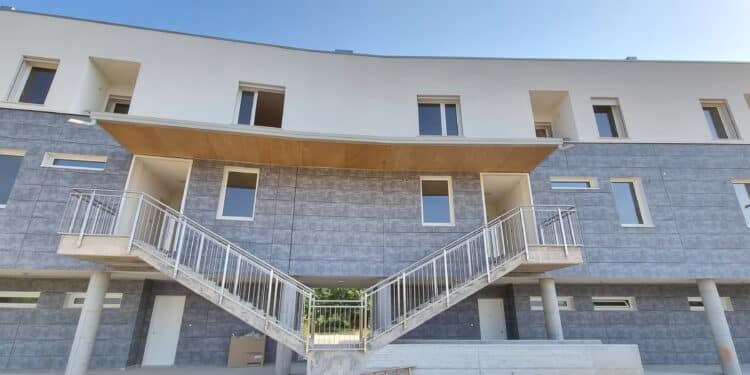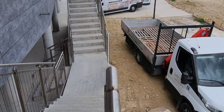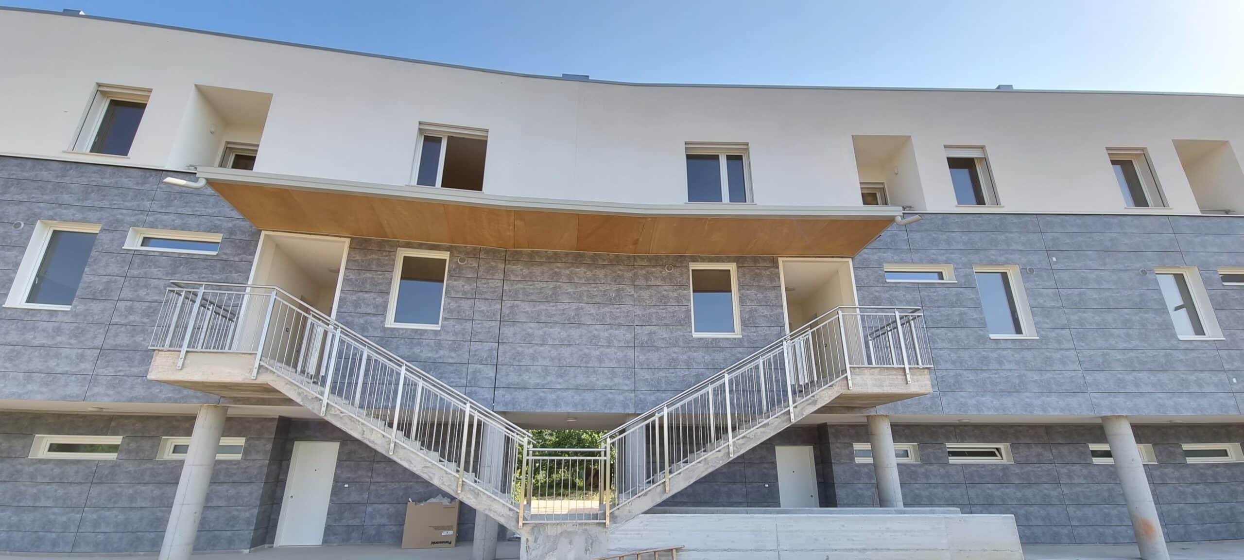 A lavoro concluso, i parapetti accompagnano in modo continuo tutti i percorsi esterni dell’edificio e completano la scala come parte integrante dell’architettura. Il fronte risulta ordinato, simmetrico e ben proporzionato, con un linguaggio semplice che valorizza la composizione delle rampe senza introdurre elementi estranei.