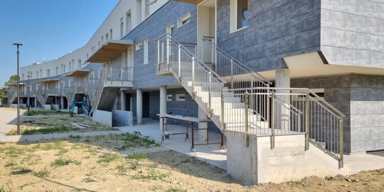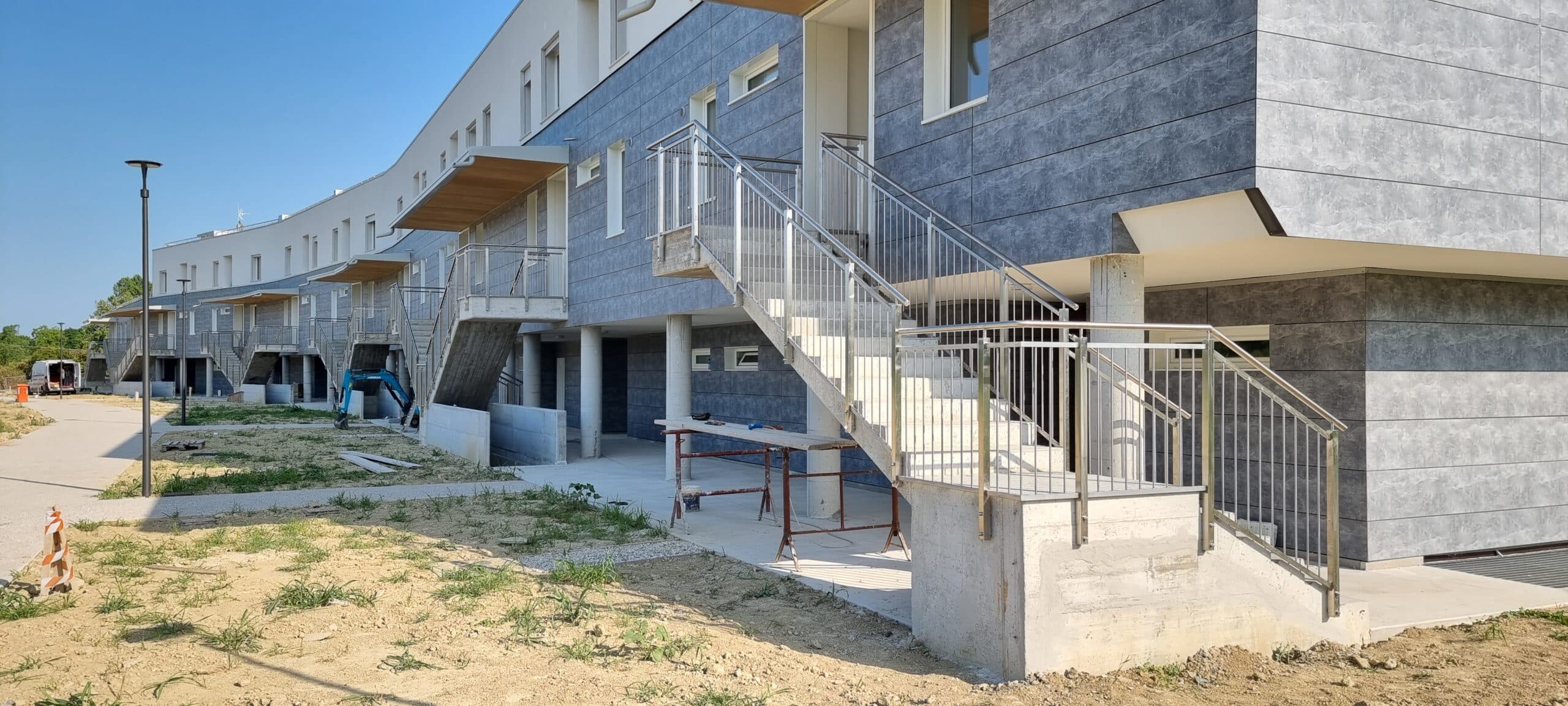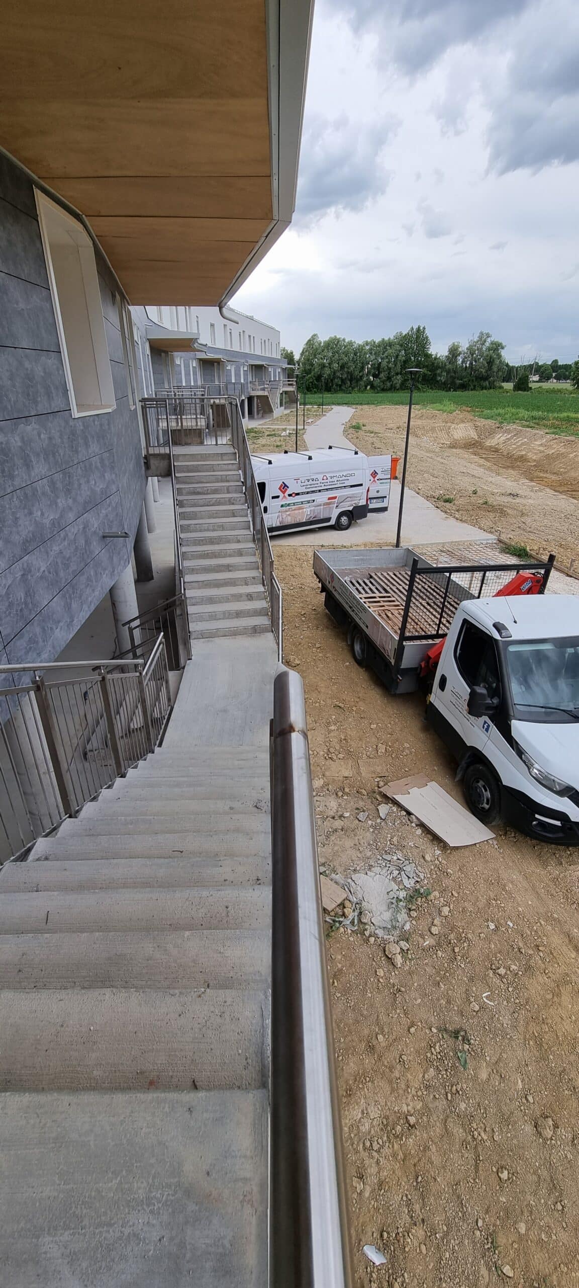 In questo intervento siamo stati coinvolti nella realizzazione dei parapetti in acciaio inox per un edificio residenziale di nuova costruzione, caratterizzato da una scala esterna doppia con sviluppo simmetrico e da pianerottoli di accesso ai diversi livelli. Il contesto richiedeva un insieme di protezioni continue, ordinato nella lettura prospettica e coerente con le linee pulite del fabbricato.