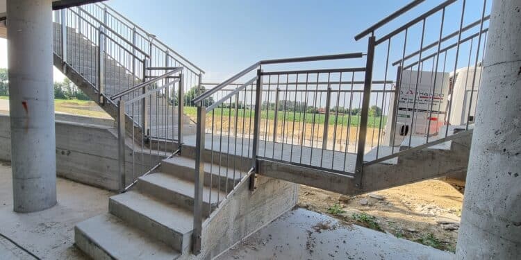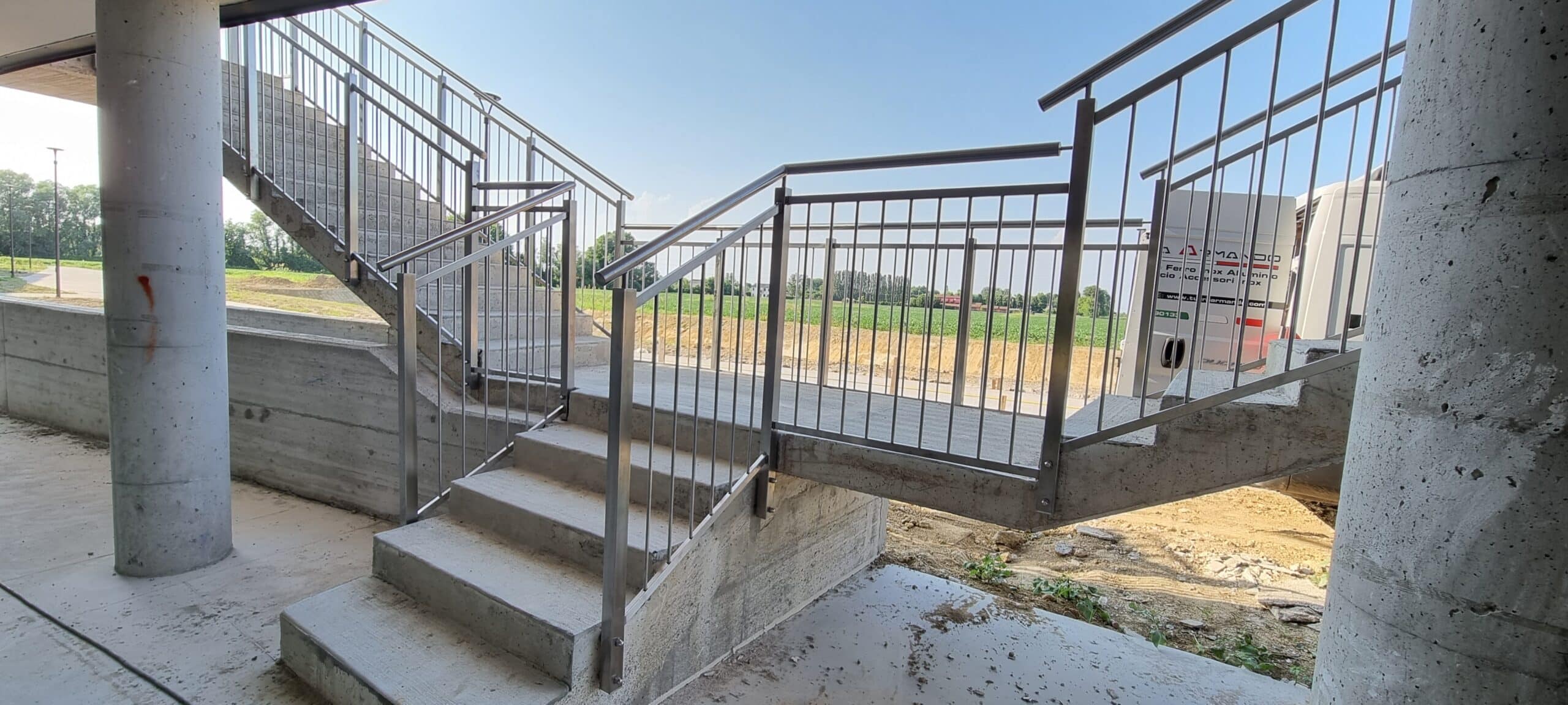 Abbiamo realizzato i parapetti per le due rampe di scala contrapposte, per i pianerottoli laterali e per la parte centrale di collegamento. Il disegno adottato è composto da montanti verticali e correnti lineari, con un’impostazione essenziale che lascia leggere bene la struttura in calcestruzzo delle scale senza appesantirla.