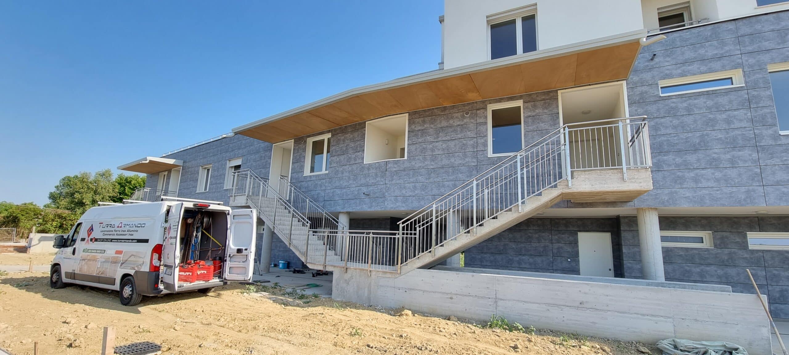 Dalle immagini si vede bene come il parapetto non fosse un elemento secondario: accompagna tutta la salita, delimita i pianerottoli e definisce in modo evidente il fronte dell’edificio. In un lavoro di questo tipo abbiamo dovuto seguire con attenzione l’andamento delle rampe, i cambi di direzione e la continuità visiva tra i vari tratti, in modo da ottenere un risultato uniforme su tutto il prospetto.